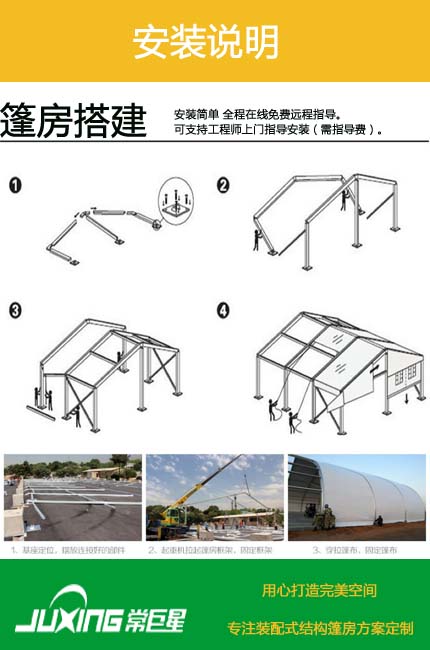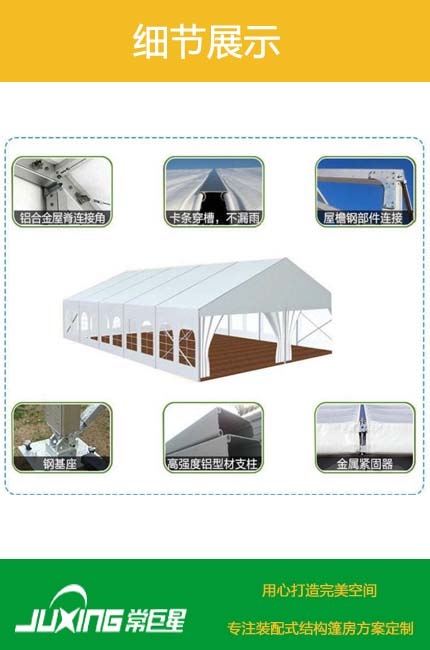 常州巨星裝配式篷房公司是一家篷房研發、生產、銷售、租賃于一體的綜合性篷房公司。巨星公司秉著誠信經營、客戶至上的經驗理念服務客戶。常巨星篷房適用于:室外臨時展廳,餐飲區、產品促銷、主題研討會、奠基儀式、戶外活動、公司慶典、短期倉庫、婚禮等。“銳意進取”的意識是巨星追趕時尚潮流的保障。美侖美奐的品質、優良周到的服務是我們至誠的追求和不變的信念。現有篷房主體框架為中空鋁合金結構,連接部位為采用國家焊接鋼結構,可調節式基座可彌補場地的不平,篷房采用PVC篷布,該篷布具有不拉伸的良好性能,不透光,采用高頻焊接技術,篷房抗風能力達到80-100公里/小時。具有體積小,儲存方便,拆裝靈活快捷易運輸等特點,單位組合式結構,可根據場地的大小自由增加,對搭建場地無特殊要求,一般場地如草地、大理石地、瀝青地面、水泥地均可。篷房內無支柱,場地空間得到利用。