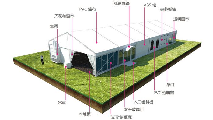 產品優勢.外觀簡潔大方. 內無支柱,百分百利用空間.可選配套設施,可加照明、排水、防撞、地臺、空調、發光燈箱、墻體、門等系統.鋁合金輕便,安裝拆卸方便快捷.廣泛應用于展會、售樓處、倉儲、景區、酒店、夜市等。